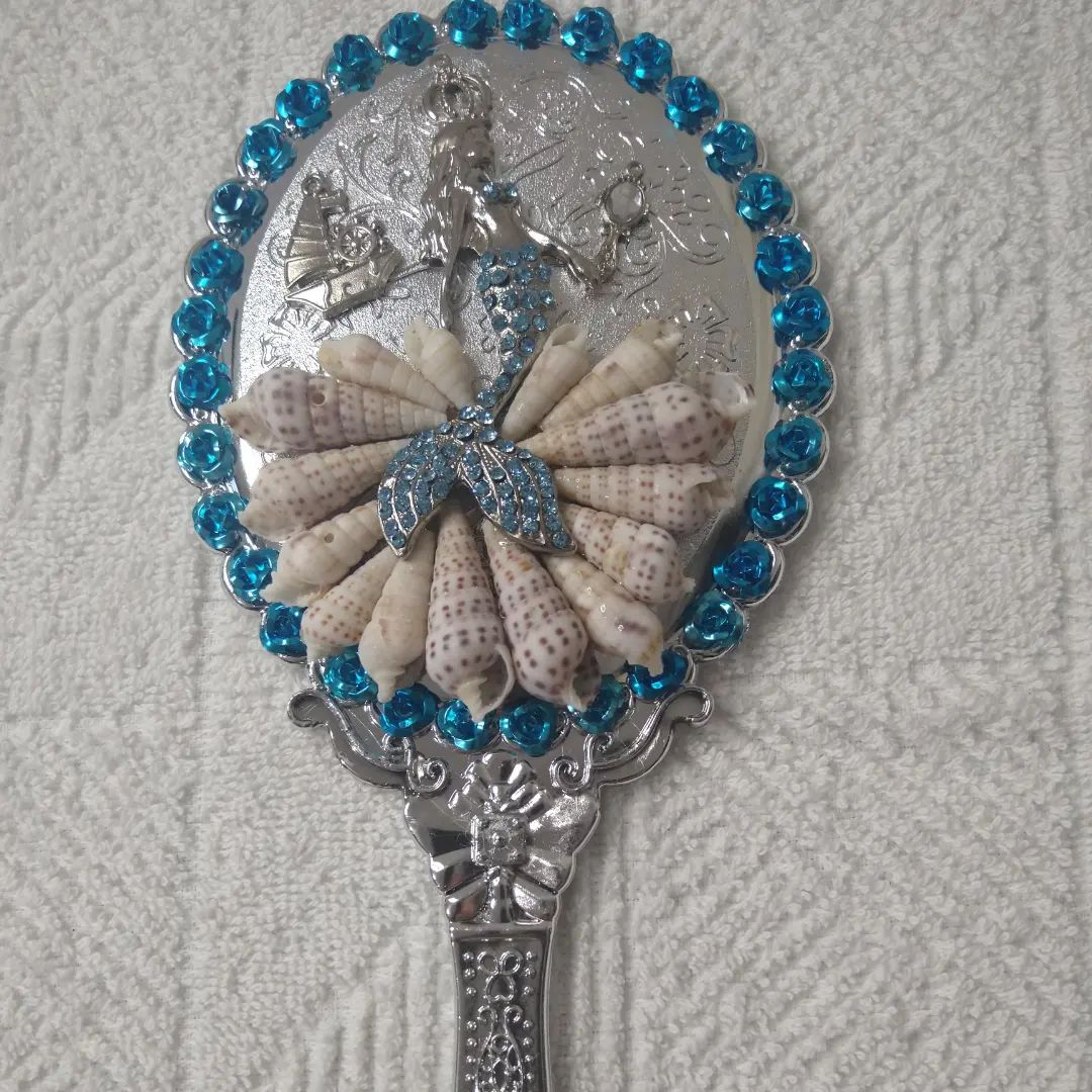 Abebê de Yemanjá material composto de vidro,alumínio e plástico (primeira linha), com 25cm de comprimento. Decorado com uma Sereia no centro do espelho com strass azuis, conchas naturais, uma coroa níquel ,um barquinho de metal também níquel e ao redor florzinhas de metalizadas azuis.